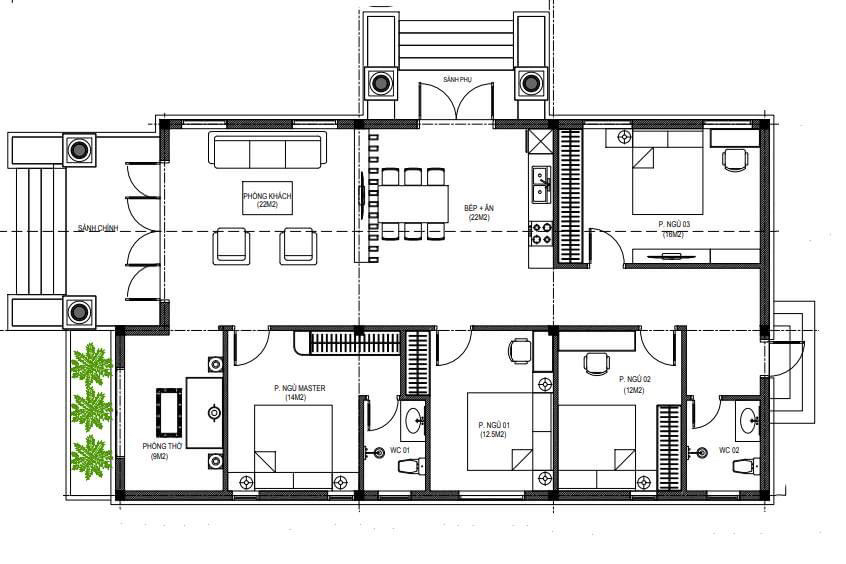 MẪU 01: NHÀ CẤP 4 MÁI THÁI 3 PHÒNG NGỦ, 2 WC