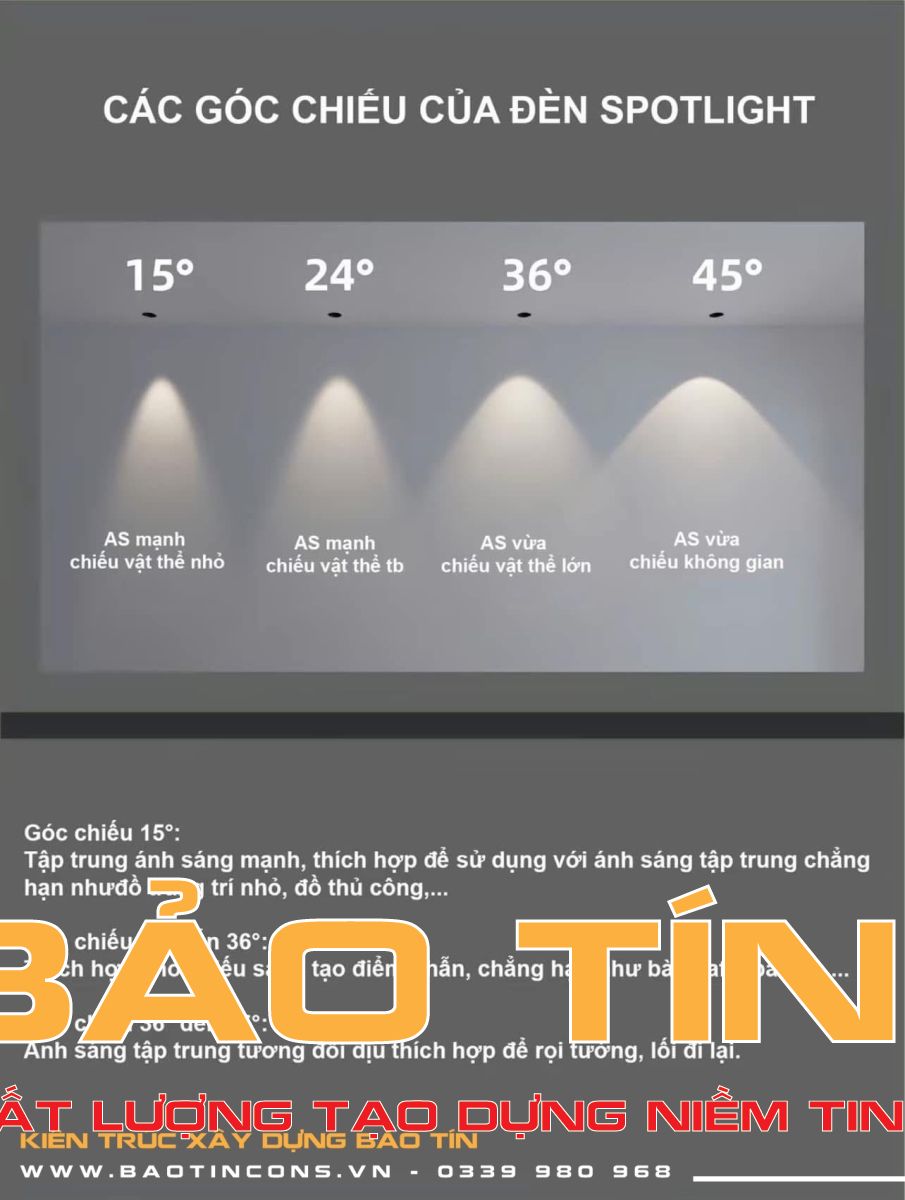 • Spotlight (Chiếu điểm): Góc chiếu hẹp <60 độ, chỉnh được góc xoay.