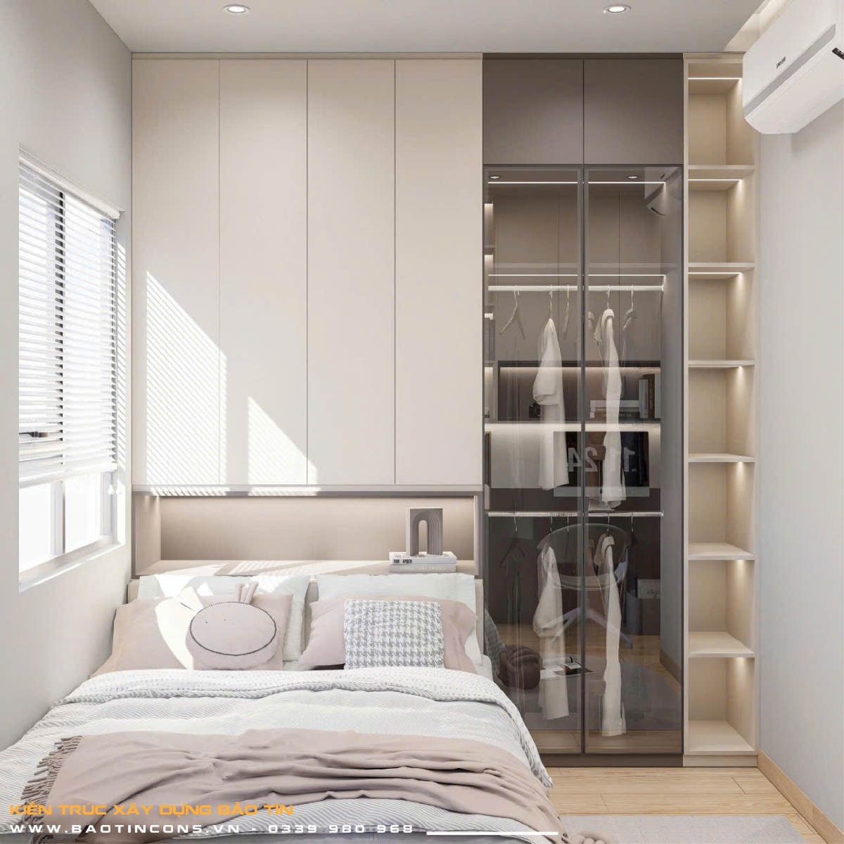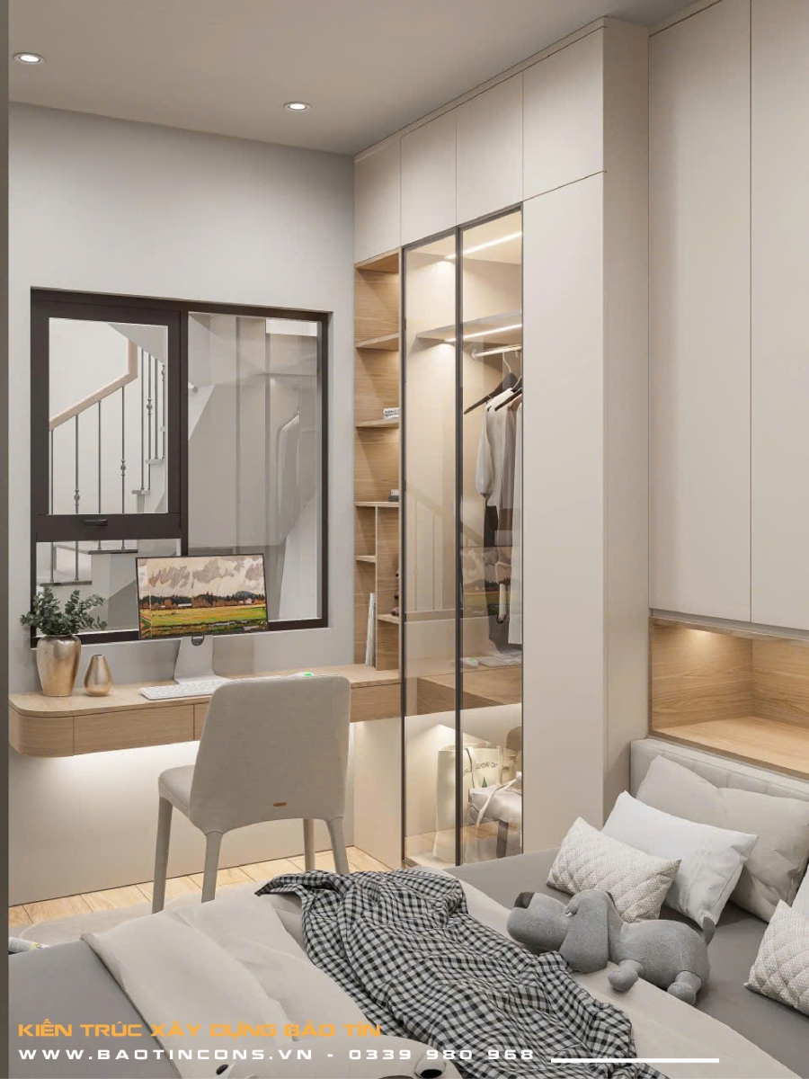 Phòng ngủ Master: Sử dụng hệ giường bục (platform bed) tích hợp ngăn kéo để đồ, tối ưu hóa diện tích mặt sàn.