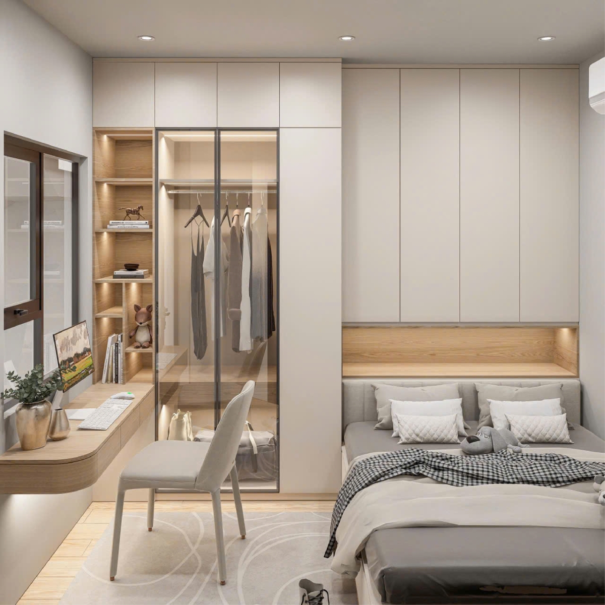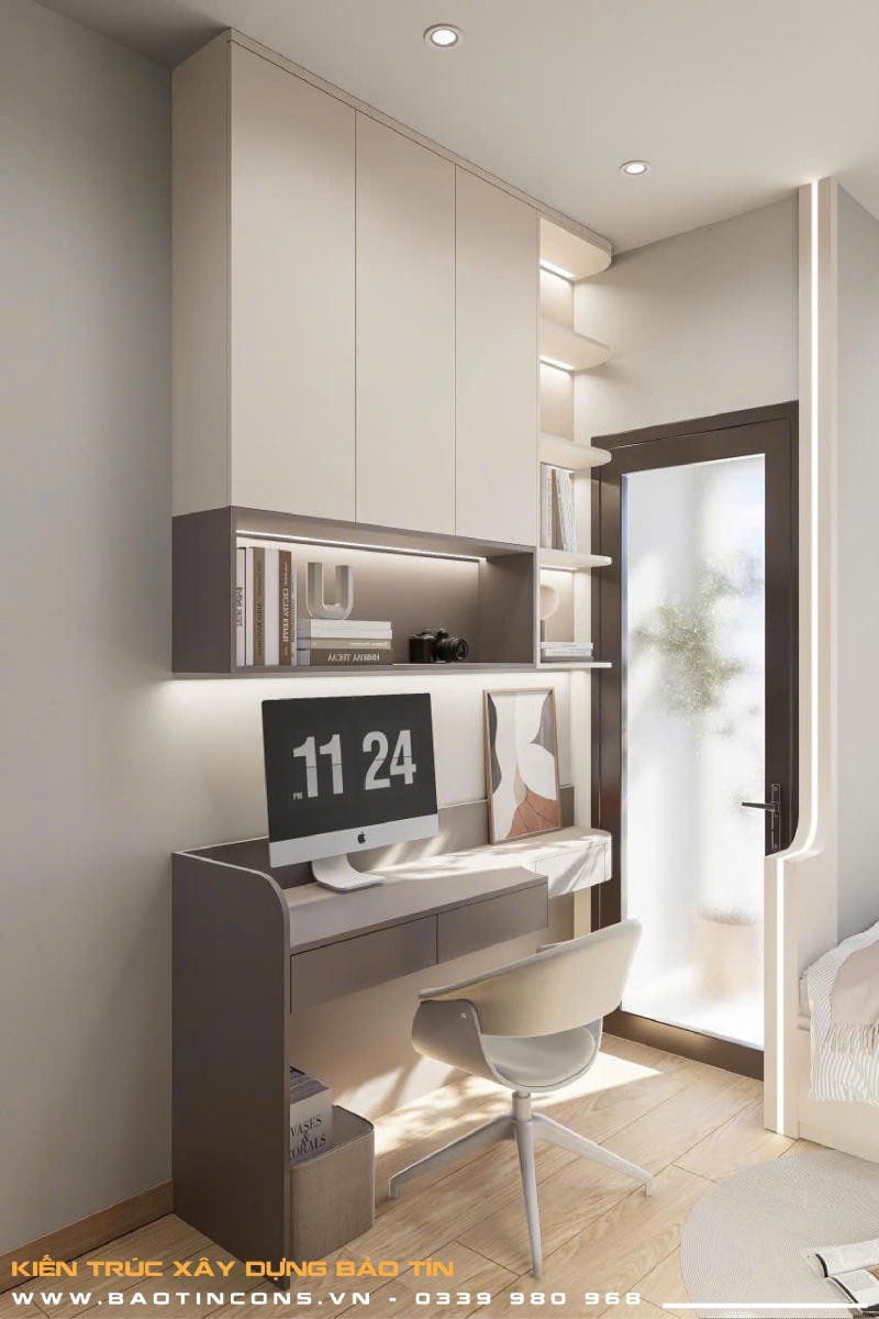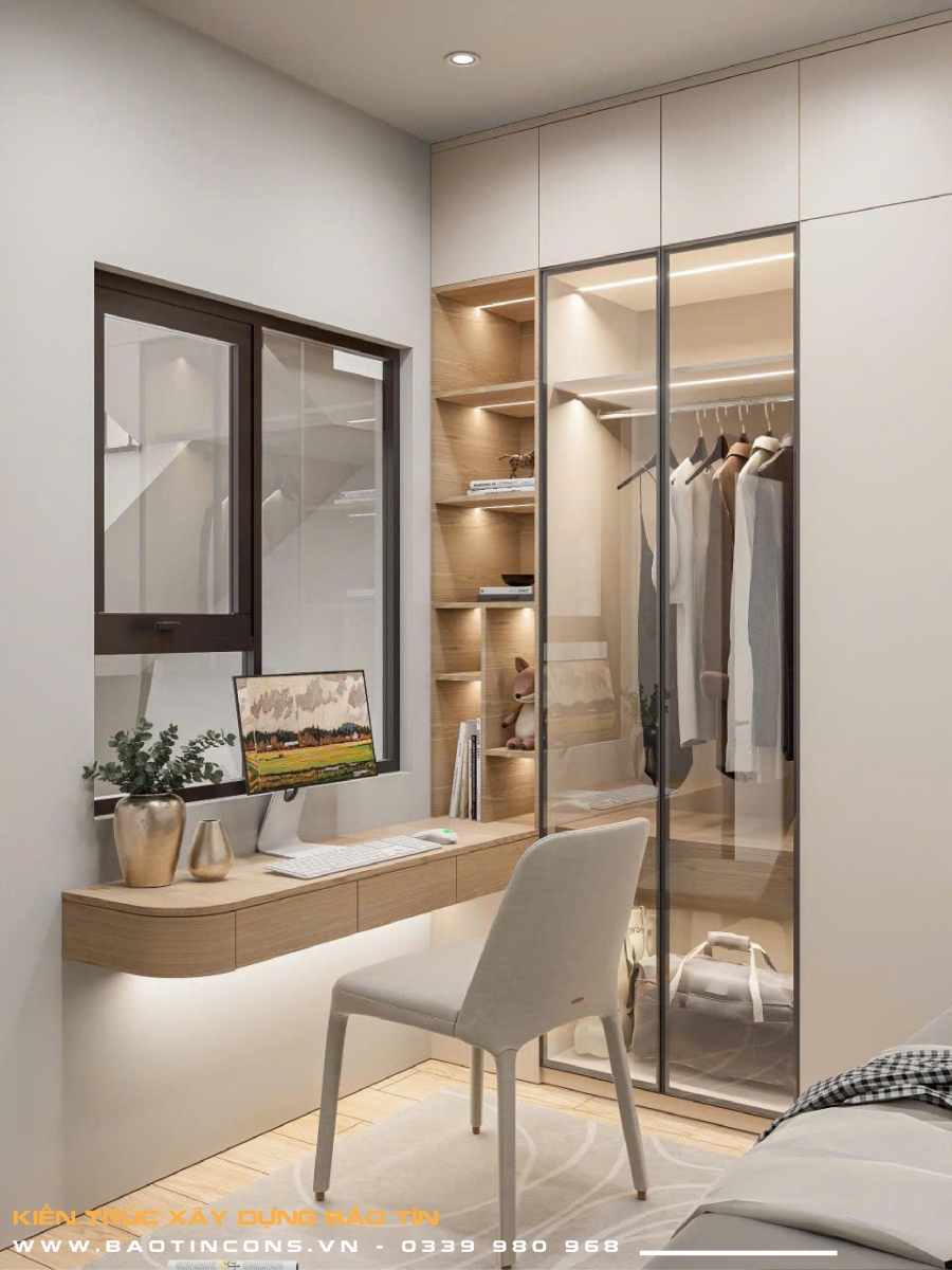 Góc làm việc & trang điểm: Được thiết kế tối giản với bàn treo tường và hệ kệ sách kịch trần, kết hợp tủ quần áo cánh kính sang trọng, giúp căn phòng trông rộng rãi hơn so với diện tích thực tế.